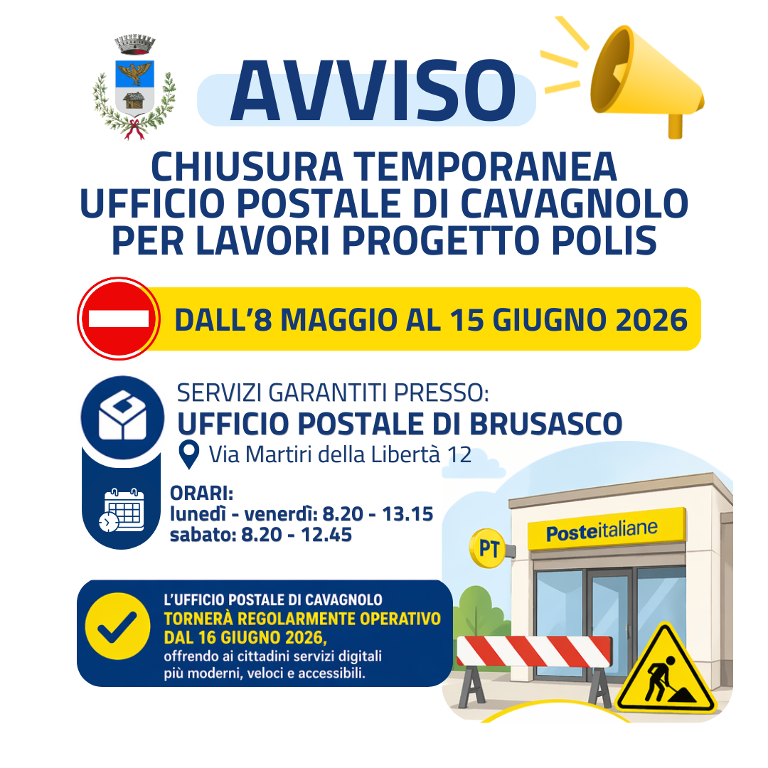 Si informa la cittadinanza che l’Ufficio Postale di Cavagnolo, situato in Via Cristoforo Colombo 120, resterà chiuso al pubblico dall'08/05/2026 al 15/06/2026. La riapertura è prevista per il giorno 16/06/2026.